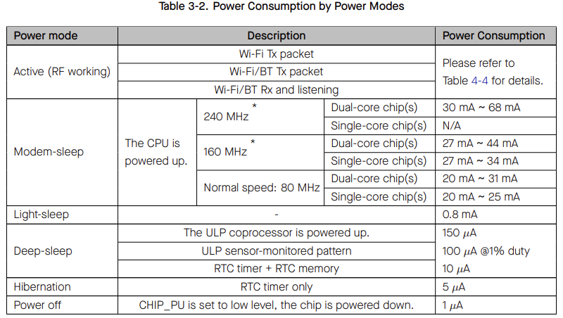 The chip radio is powered up. The chip can receive, transmit, or listen. – Modem-sleep mode: The CPU is operational and the clock is configurable. The Wi-Fi/Bluetooth baseband and radio are disabled. – Light-sleep mode: The CPU is paused. The RTC memory and RTC peripherals, as well as the ULP coprocessor are running. Any wake-up events (MAC, SDIO host, RTC timer, or external interrupts) will wake up the chip. – Deep-sleep mode: Only the RTC memory and RTC peripherals are powered up. Wi-Fi and Bluetooth connection data are stored in the RTC memory. The ULP coprocessor is functional. – Hibernation mode: The internal 8 MHz oscillator and ULP coprocessor are disabled. The RTC recovery memory is powered down. Only one RTC timer on the slow clock and certain RTC GPIOs are active. The RTC timer or the RTC GPIOs can wake up the chip from the Hibernation mode.