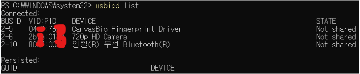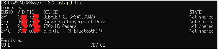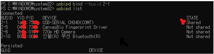 위 명령어 실행 후 usbipd list를 통해 다시 확인해보면 다음과 같이 STATE가 Shared로 바뀐것을 확인 가능