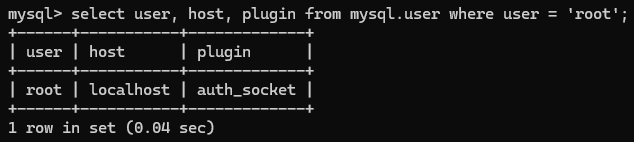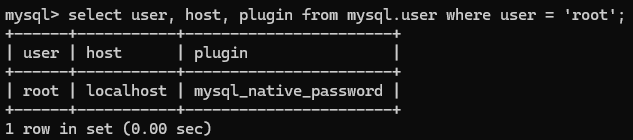 SELECT user, host, plugin FROM mysql.user WHERE user = 'root';