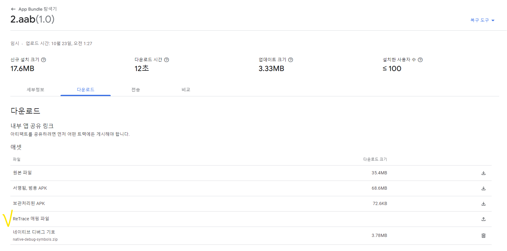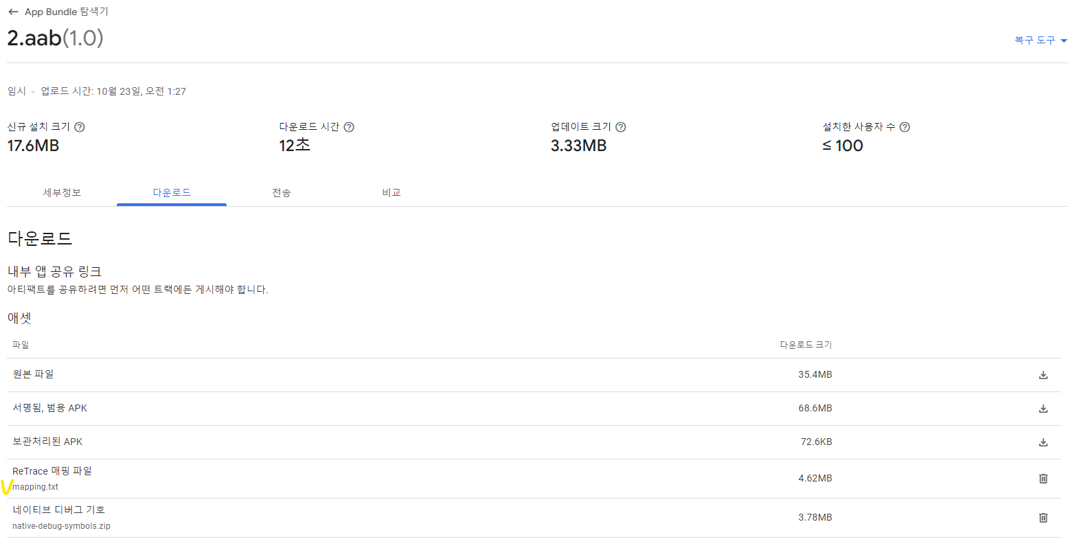 App Bundle 탐색기 -> 앱 버전 선택 -> 다운로드 -> ReTract 매핑 파일 업로드