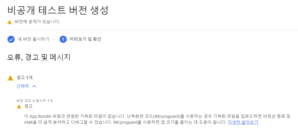 구글 플레이 콘솔을 통해 Android 앱을 Play Store에 등록하는 과정에서, 위와 같은 경고 오류를 만날 수 있다.