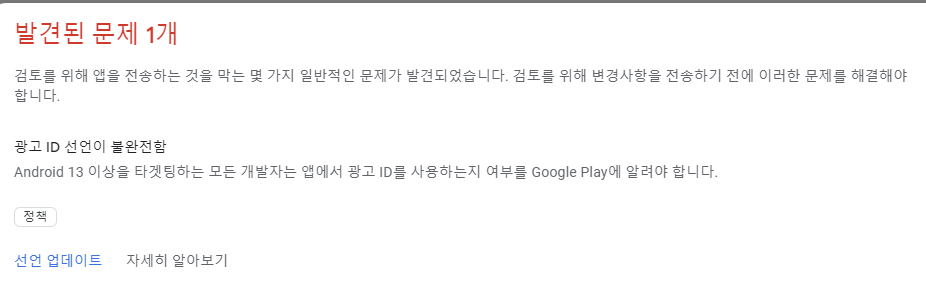 광고 ID 선언과 관련하여, 광고를 직접적으로 넣은 적이 없어서 사용하지 않음으로 선택했으나, 위 문제가 해결되지 않음