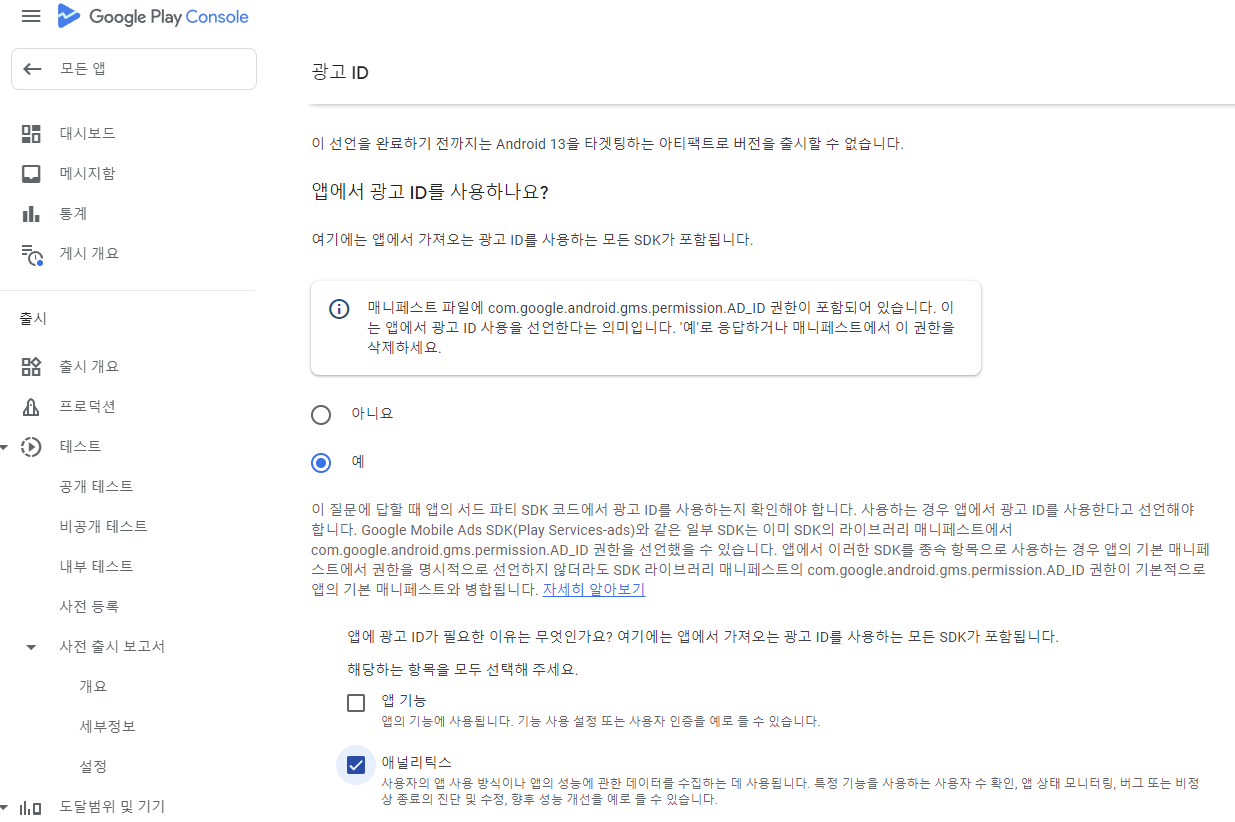 나의 경우는 광고 ID 선언을 사용한다고 표시하고, 애널리틱스 목적이라고 수정한다.