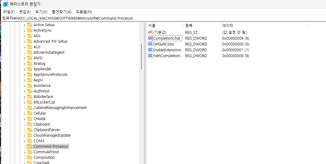 HKEY_LOCAL_MACHINE \ SOFTWARE \ Microsoft \ CommandProcessor 를 클릭