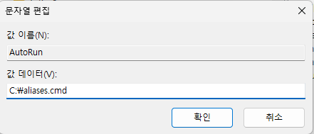 원하는 경로 (예: C:\aliases.cmd)에 script를 작성한다.