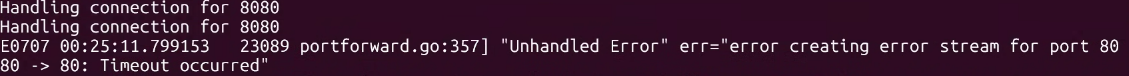 an error occurred forwarding 8080 -> 80: error forwarding port 80 to pod e5805d80406543402a2e0bdc39f0803c73310a71868e03c60f41bb247f6c27fa, uid : exit status 1: 2025/07/06 15:30:00 socat[16358] E connect(5, AF=2 127.0.0.1:80, 16): Connection refused