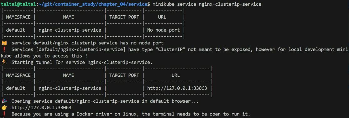 - 터미널에서 아래 명령어를 실행하세요. nginx-clusterip-service를 대상으로 직접 연결할 수 있습니다.출력 예시: